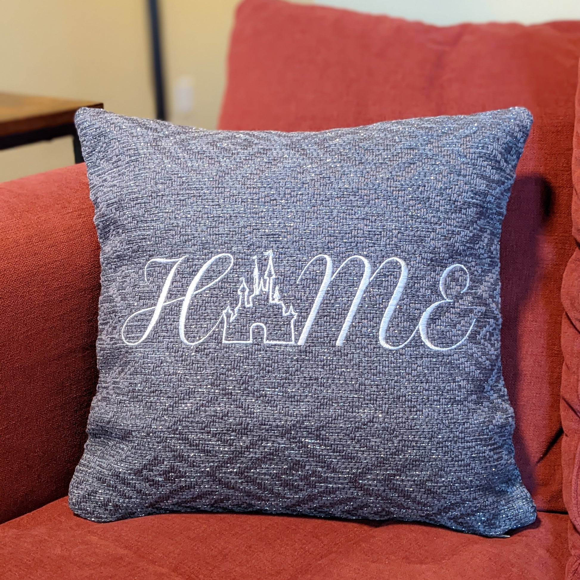 Embroidered "Home" with a castle on a beautiful dark gray 16 x 16-inch pillow cover. This fabric has a great design and texture weaved into it with subtle silver sparkle! Perfect to add some Disney-inspired magic to your space!