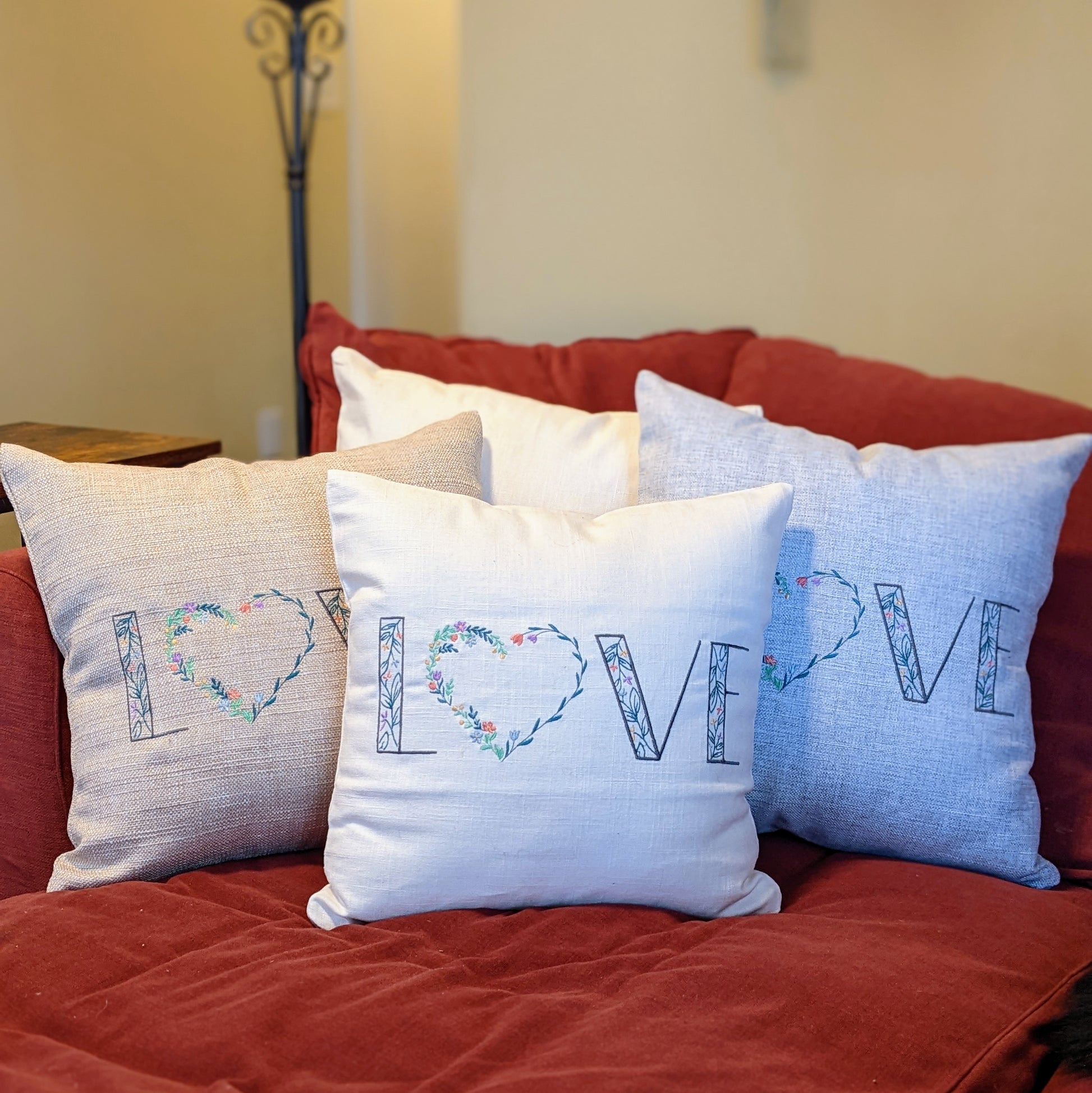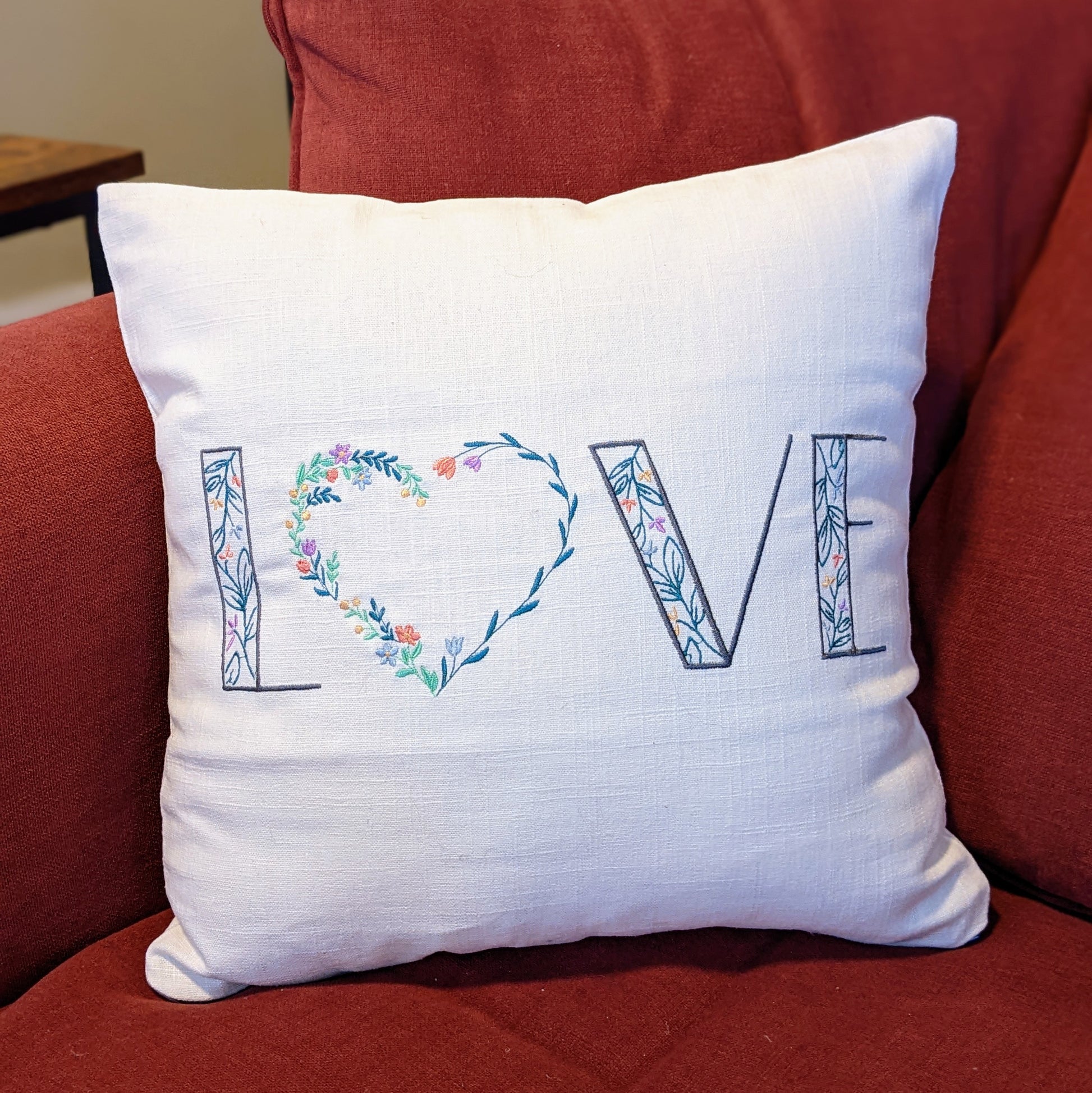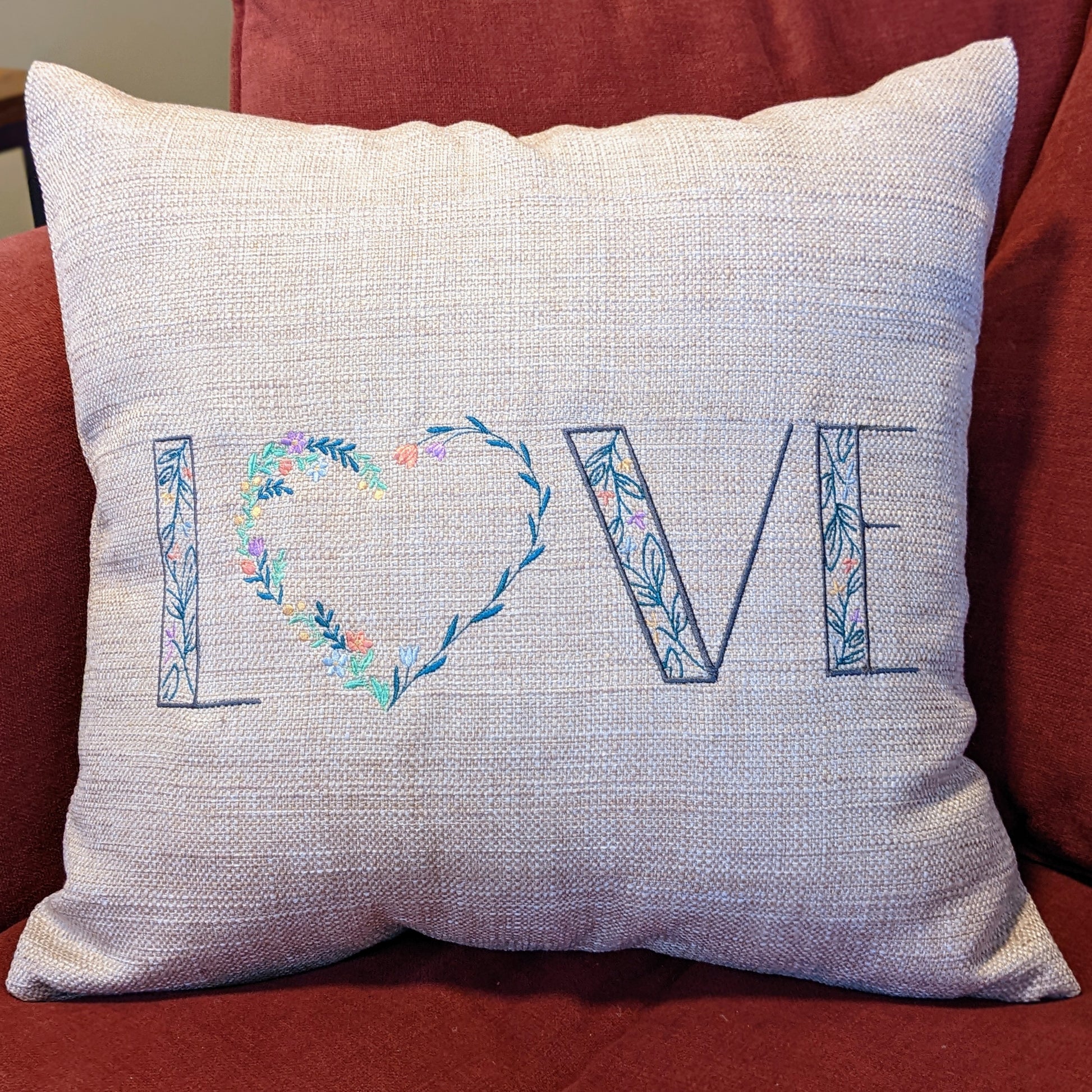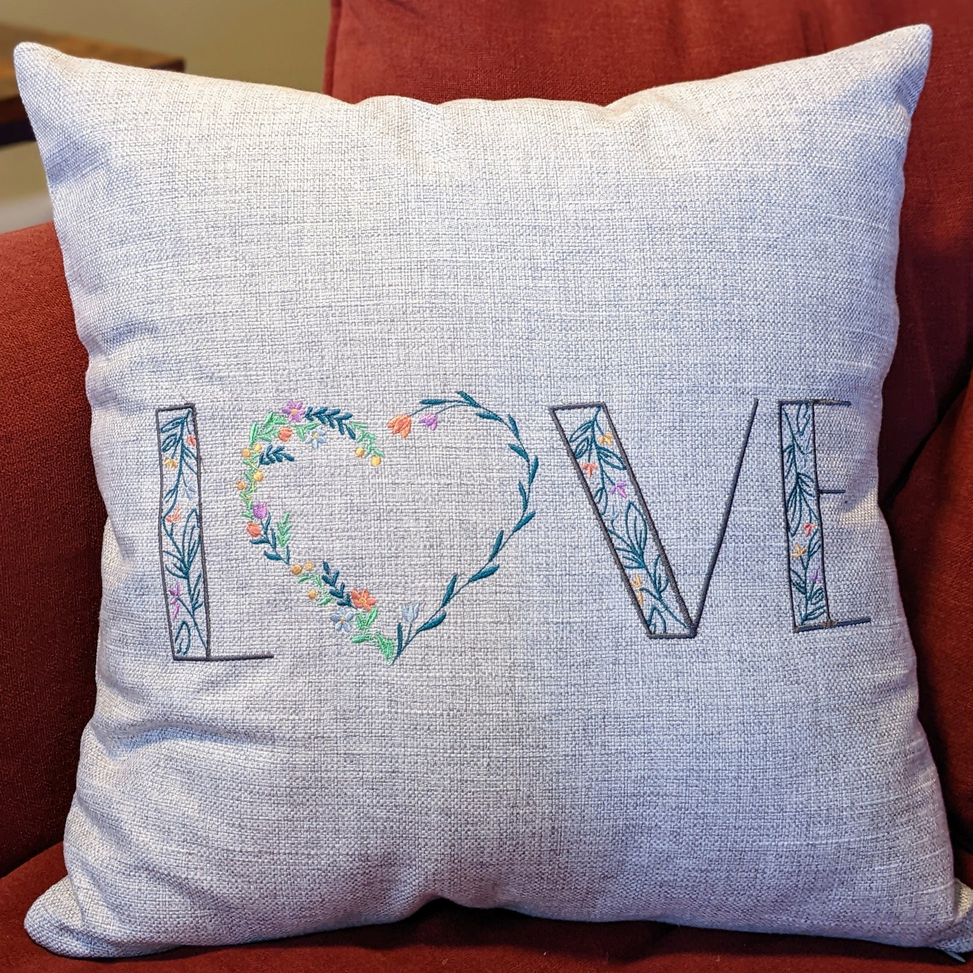 Embroidered "LOVE" in a floral font, with a floral wreath heart for the "O" on an 18 x18 inch pillow cover.