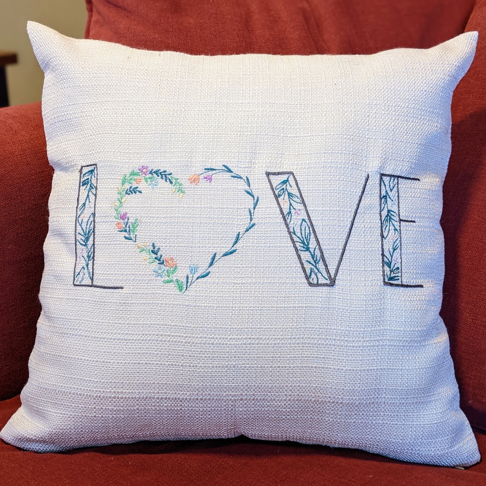 Embroidered "LOVE" in a floral font, with a floral wreath heart for the "O" on an 18 x18 inch pillow cover.