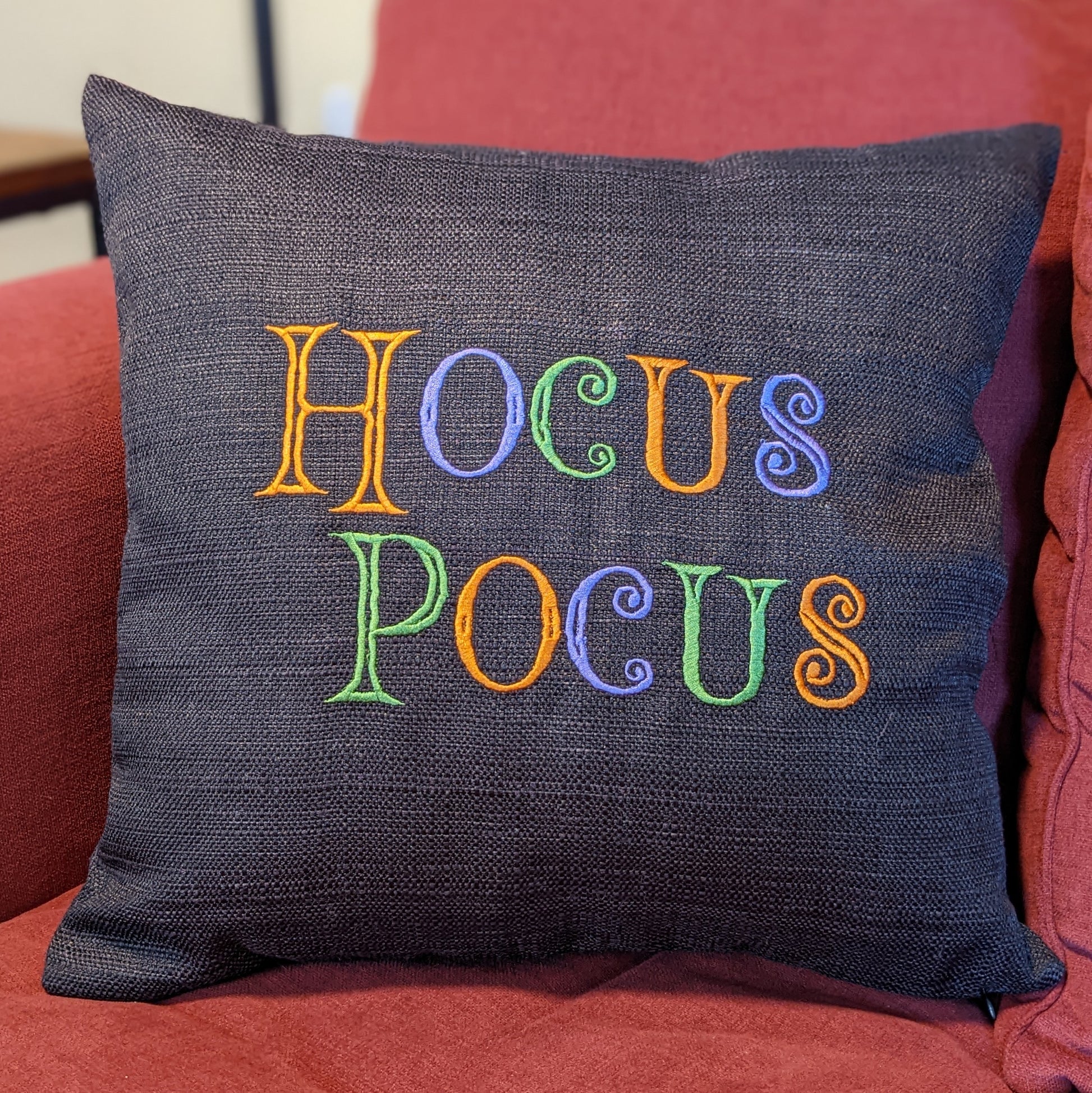 Embroidered "Hocus Pocus" in fun colors on an 18 x18 inch pillow cover. Put a spell on your guests and transform any room with the Halloween spirit!