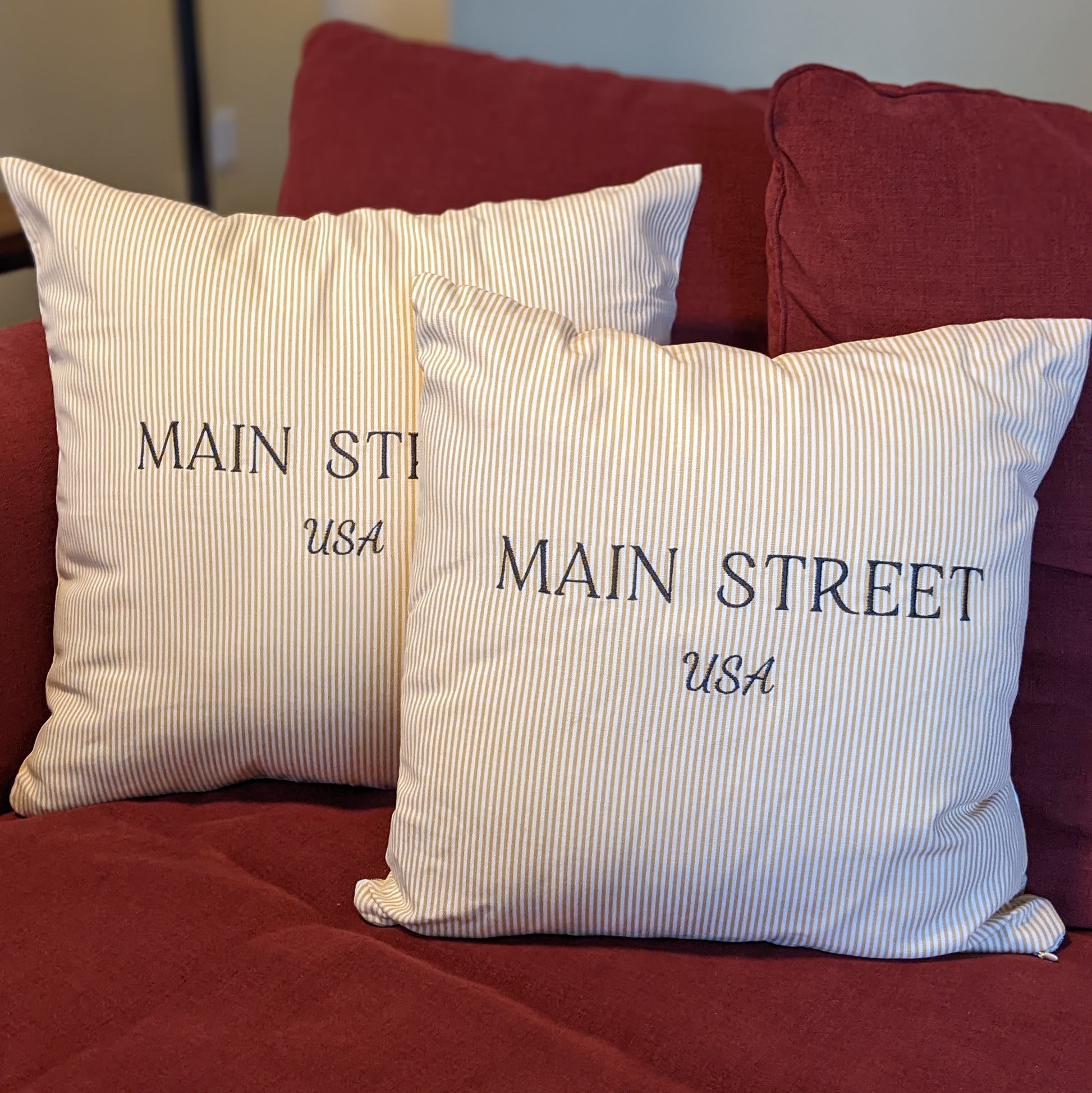 Embroidered "Main Street USA" on a 16 x 16-inch or 18 x 18-inch pillow cover. The fabric is a light yellow and cream stripe cotton with a very dark charcoal thread. Perfect to add some Disney magic to your space!