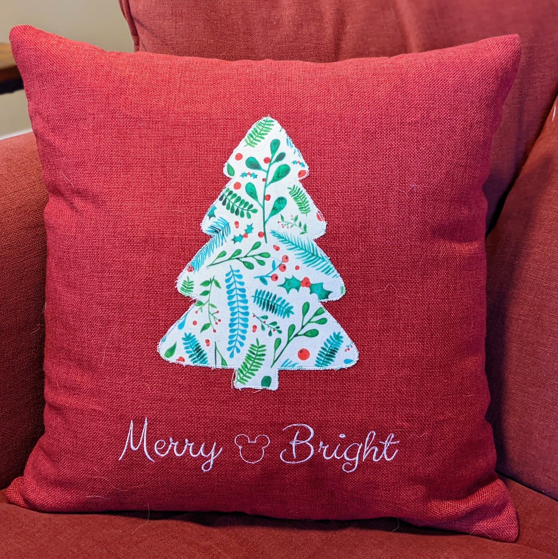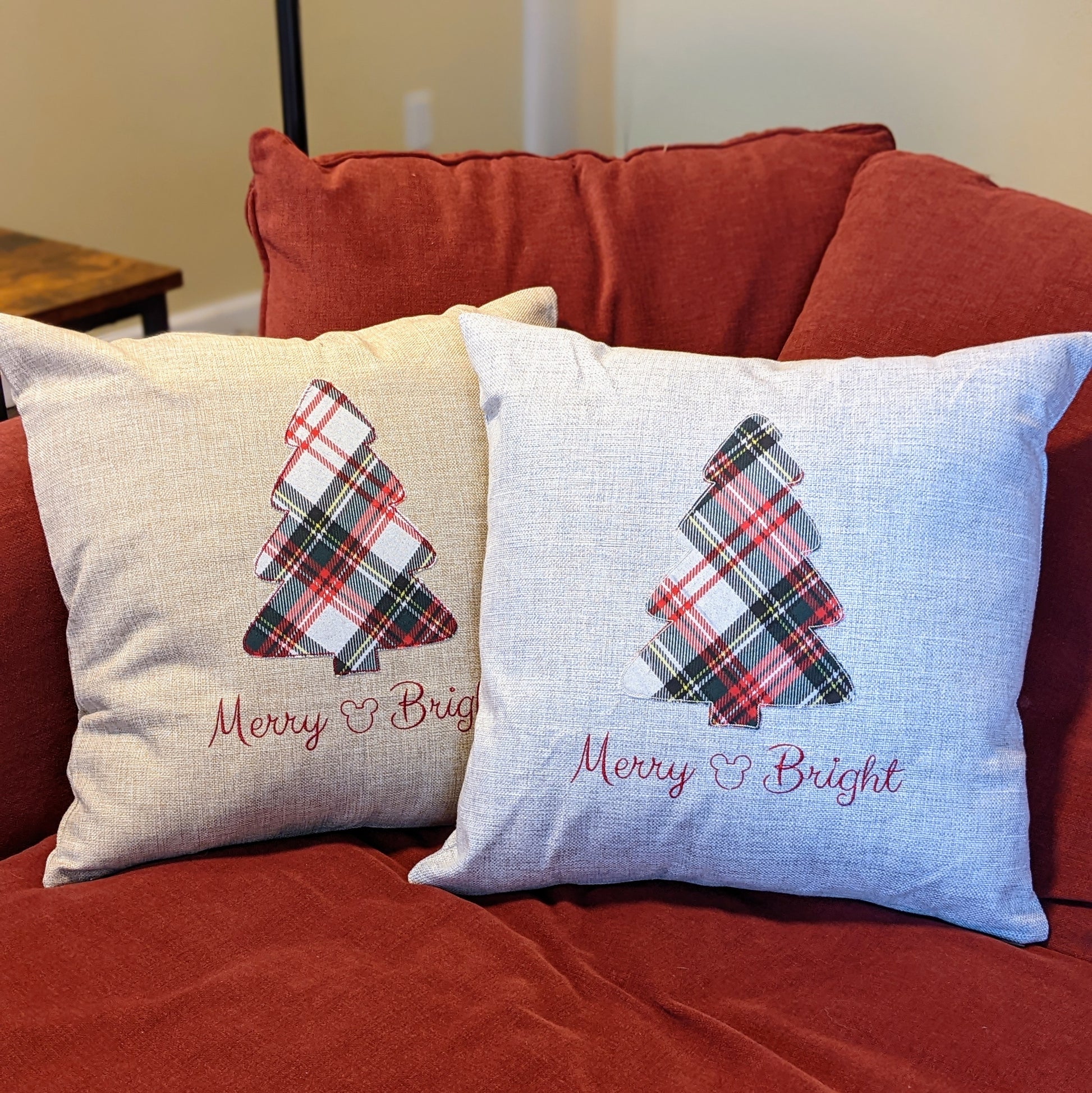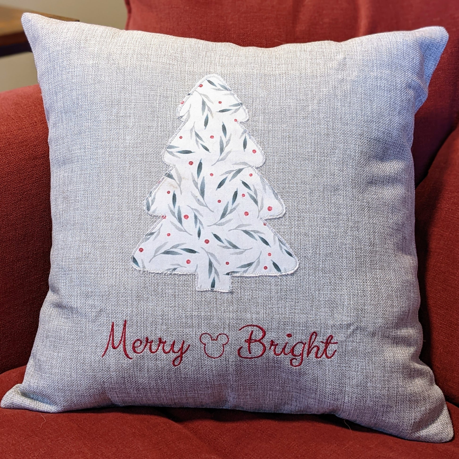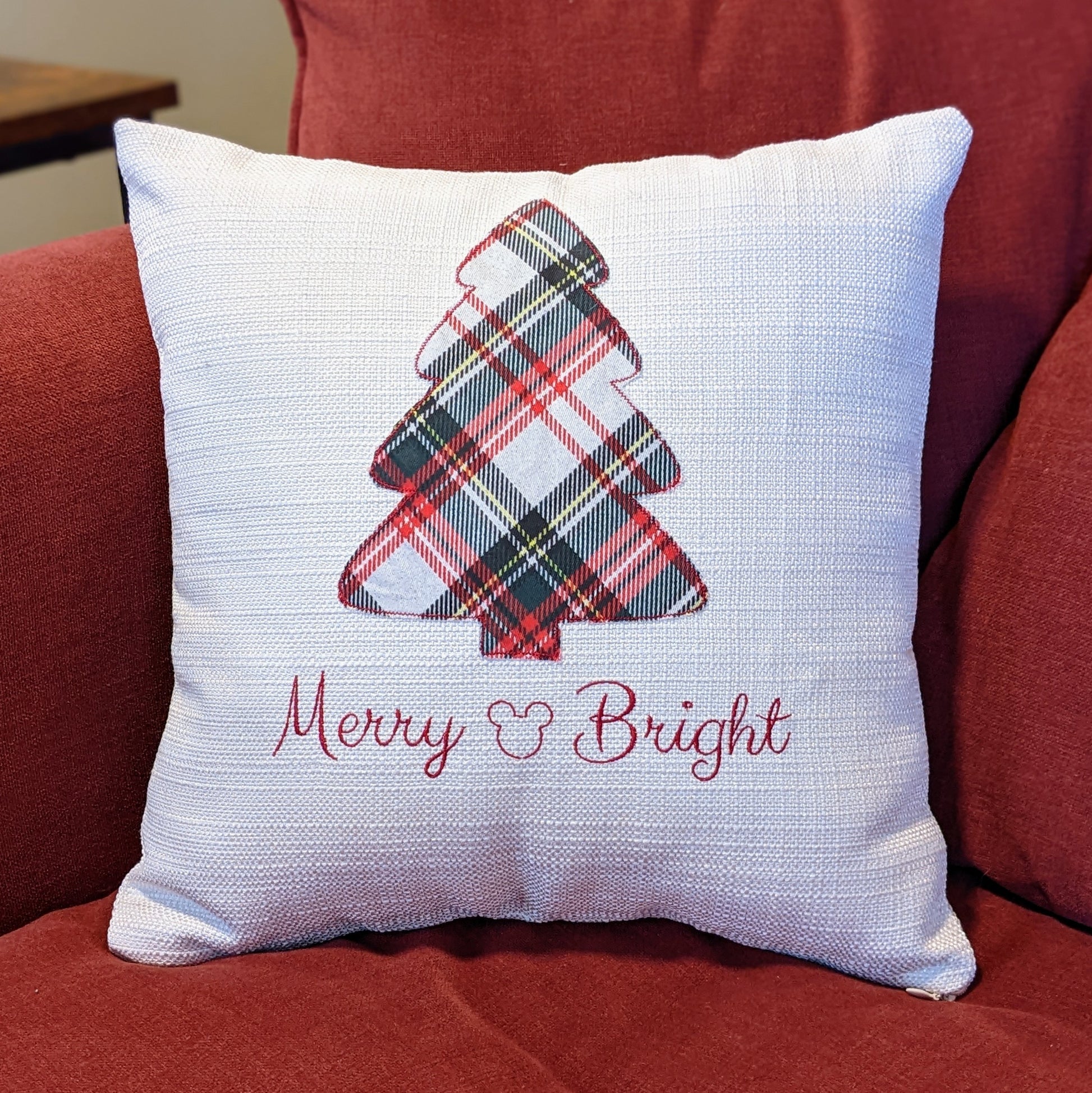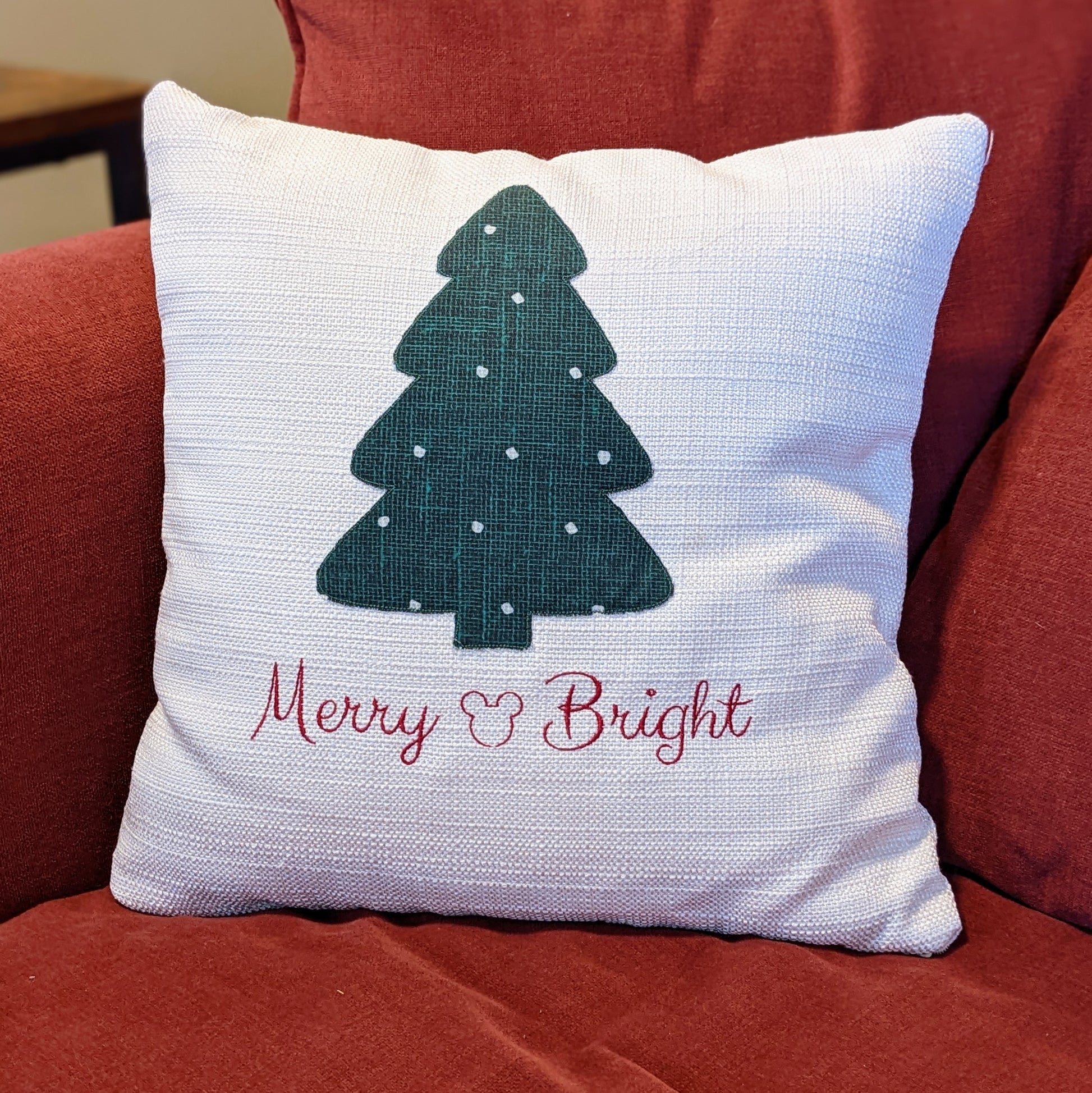 Most pillows have feature a Mickey between "Merry" and "Bright." Indicated versions have a snowflake instead.
