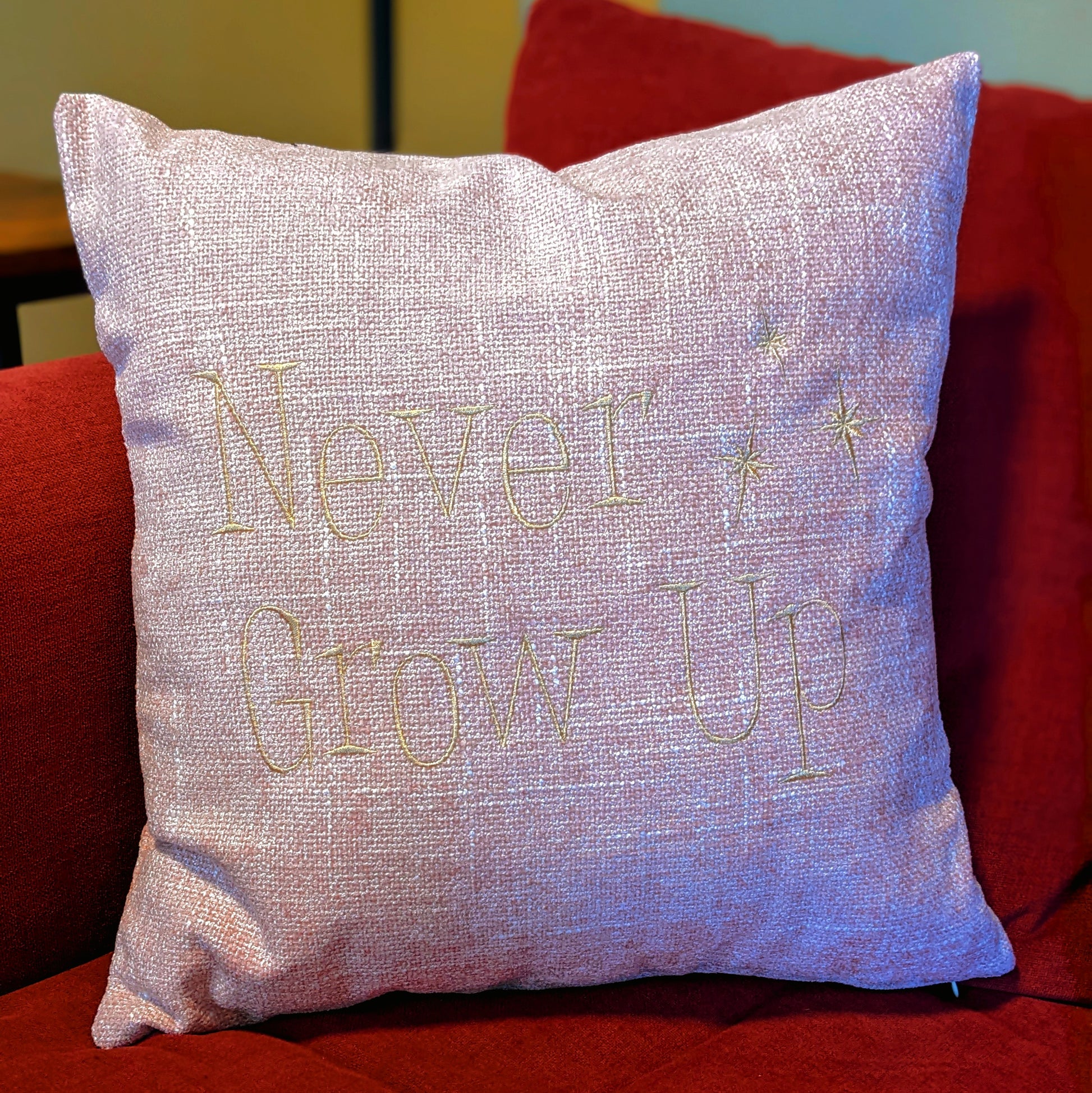 Embroidered "Never Grow Up" on an 18 x 18 inch or 16 x 16 inch pillow cover. Perfect for a nursery, as a throw pillow on your bed, or on your couch in your living room! This pillow cover has a lovely diamond pattern on it and is very soft.